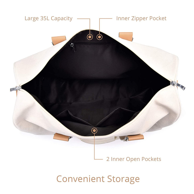 La bolsa de fin de semana grande y espaciosa se crea con lienzo de calidad superior y suaves acentos de cuero falso marrón. Durable y no fácil de usar, más simple y más elegante en apariencia.
