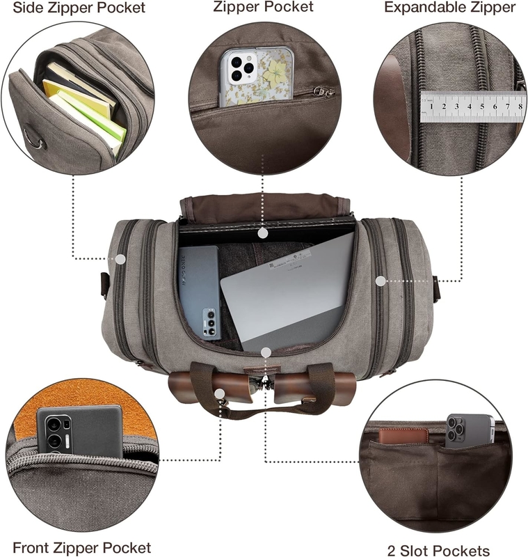 El robusto lienzo grueso, el cuero de alta calidad y el hardware resistente y las suaves cremalleras SBS lo convierten en una gran bolsa de viaje con mango acolchado para llevarla cómodamente.No hay necesidad de preocuparse por la calidad.