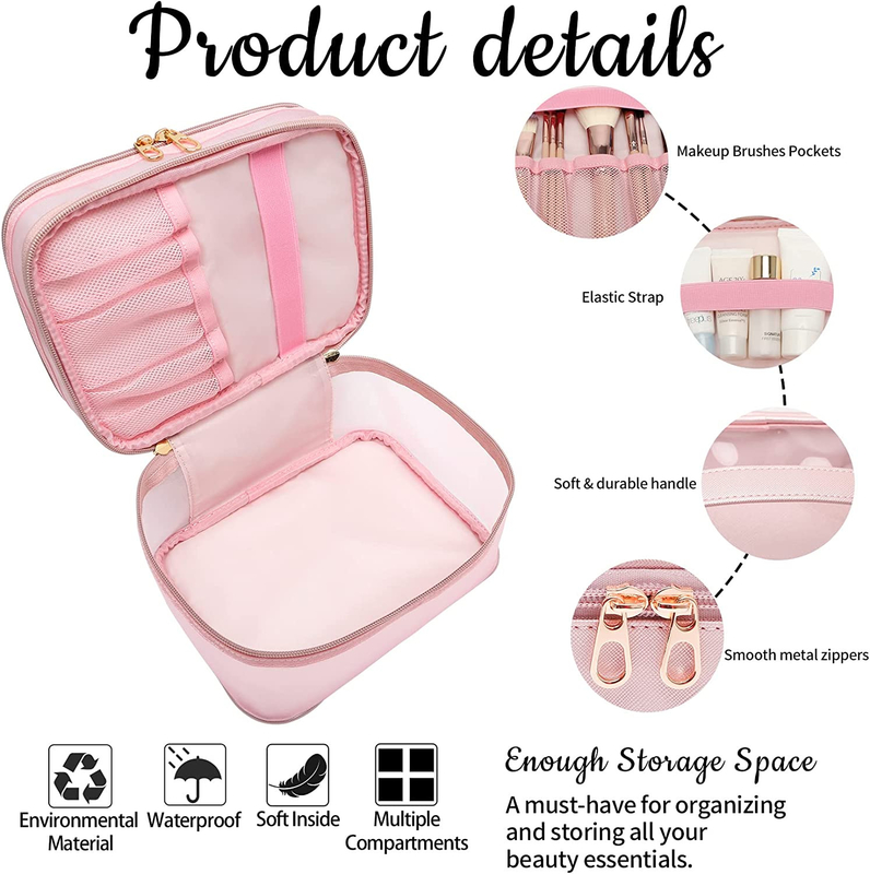 Bolsa de maquillaje de gran capacidad - Esta bolsa de maquillaje es lo suficientemente grande como para almacenar todo su maquillaje y accesorios cosméticos,Hay 5 bolsillos elásticos en el compartimiento superior para acomodar pinceles de maquillaje de diferentes tamaños y mantenerlos en su lugarEl compartimiento principal es lo suficientemente grande como para contener artículos grandes como secador de pelo de viaje, champú, etc.
