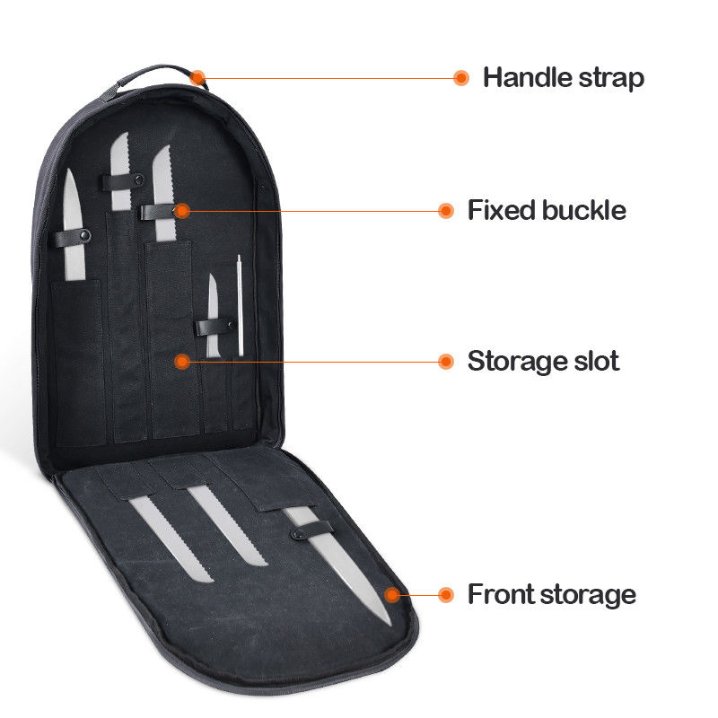- Perfecta funcionalidad Knife Backpack proporciona 8 ranuras separadas para cuchillos de cocina incluyendo corte, tallado, cerámica, tijeras.La mochila del cuchillo proporciona golpes para cortador de carne y afinar el acero.Cada ranura está diseñada para mantener los cuchillos en las ranuras y evitar que se deslicen fuera de la ranura. La mochila para cuchillos también proporciona un bolsillo cerrado para almacenar otras herramientas y cosas,como el teléfono celular.- ¿Qué quieres?