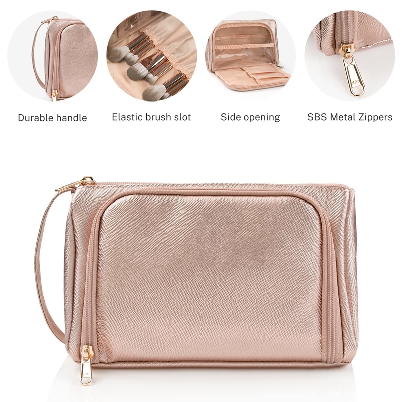 Bolso portátil de maquillaje de toallas de cuero rosa dorado PU bolso de viaje a medida a prueba de agua 1