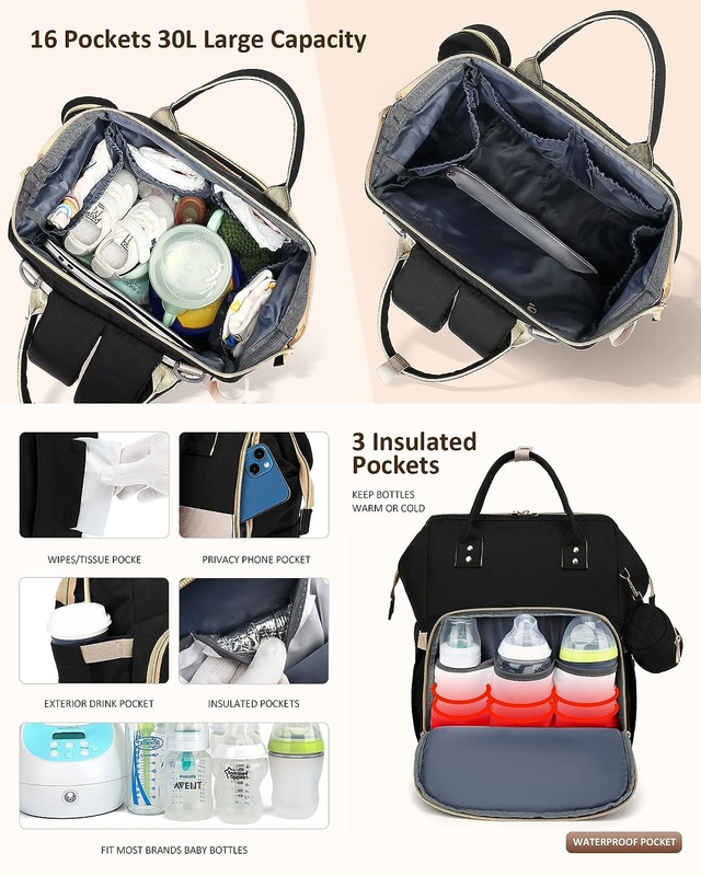 Con una capacidad de 30 litros y 16 bolsillos, esta mochila para bebé facilita que los padres traigan botellas de leche, ropa extra, pañales, toallitas, juguetes y otros artículos esenciales.